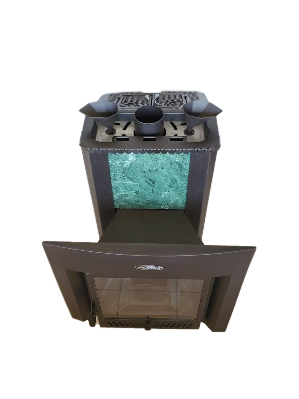 Конструктивной особенностью печей также является наличие в верхней части каменки двух дверц, обеспечивающих прямой доступ для поддач непосредственно на верхние камни. Данные дверцы в закрытом состоянии обеспечивают равномерный нагрев каменки до температур свыше 500градусов. А в открытом состоянии дверцы обеспечивают при необходимости более ускоренный прогрев парного помещения в холодное время года. А также в совокупности с системой продувки каменки, обеспечивают просушку парильного помещения по завершению банных процедур.